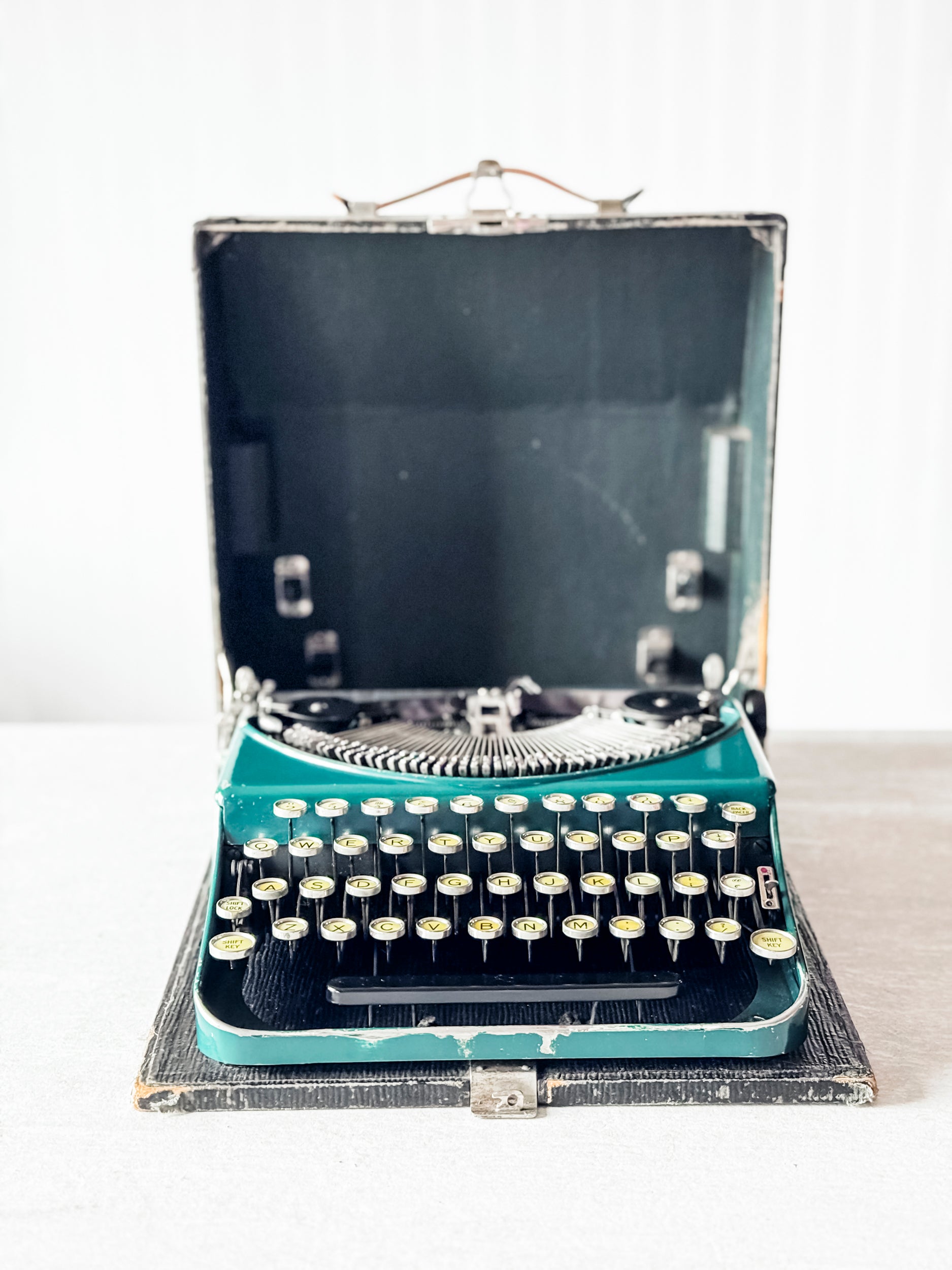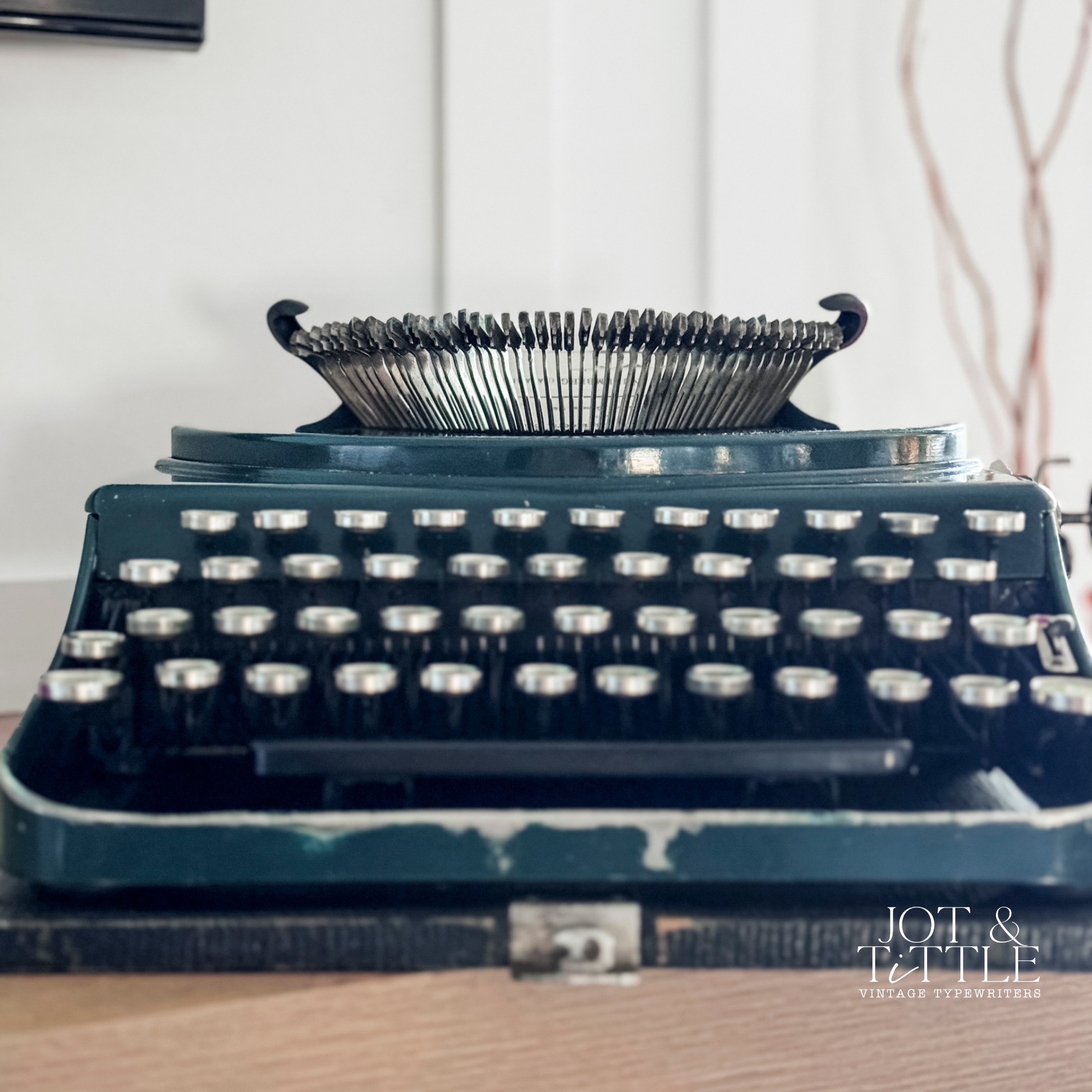 EXTERIOR + CASE: The typewriter is attached to the base and has a hard top cover that snaps in place. The original green finish shows considerable wear, but the typewriter still looks good.
