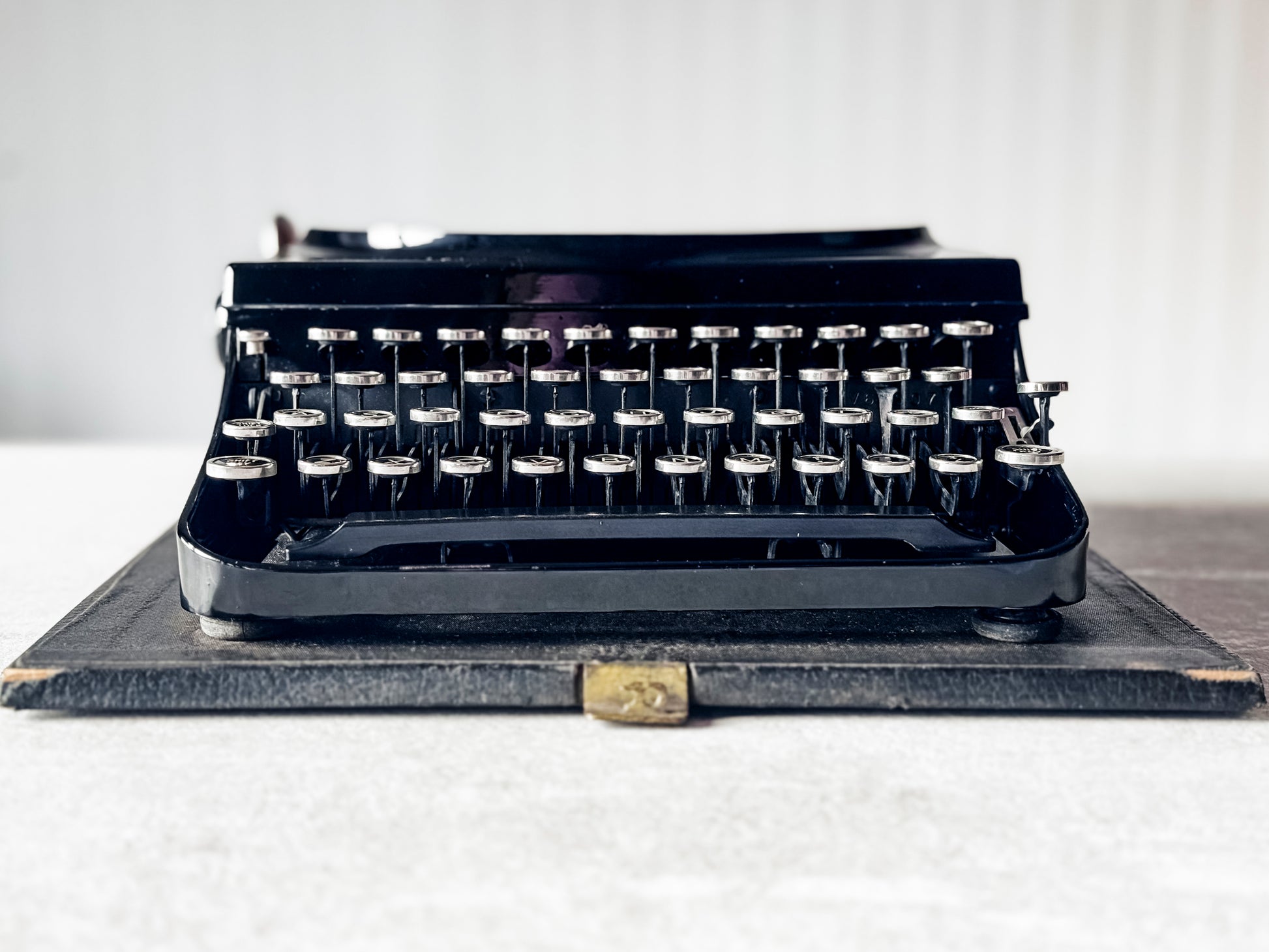 EXTERIOR + CASE: This typewriter is attached to a base but can be removed. A hard-sided top snaps in place over the typewriter. The case is still sturdy, though the handle is missing. The finish of the typewriter is beautiful!