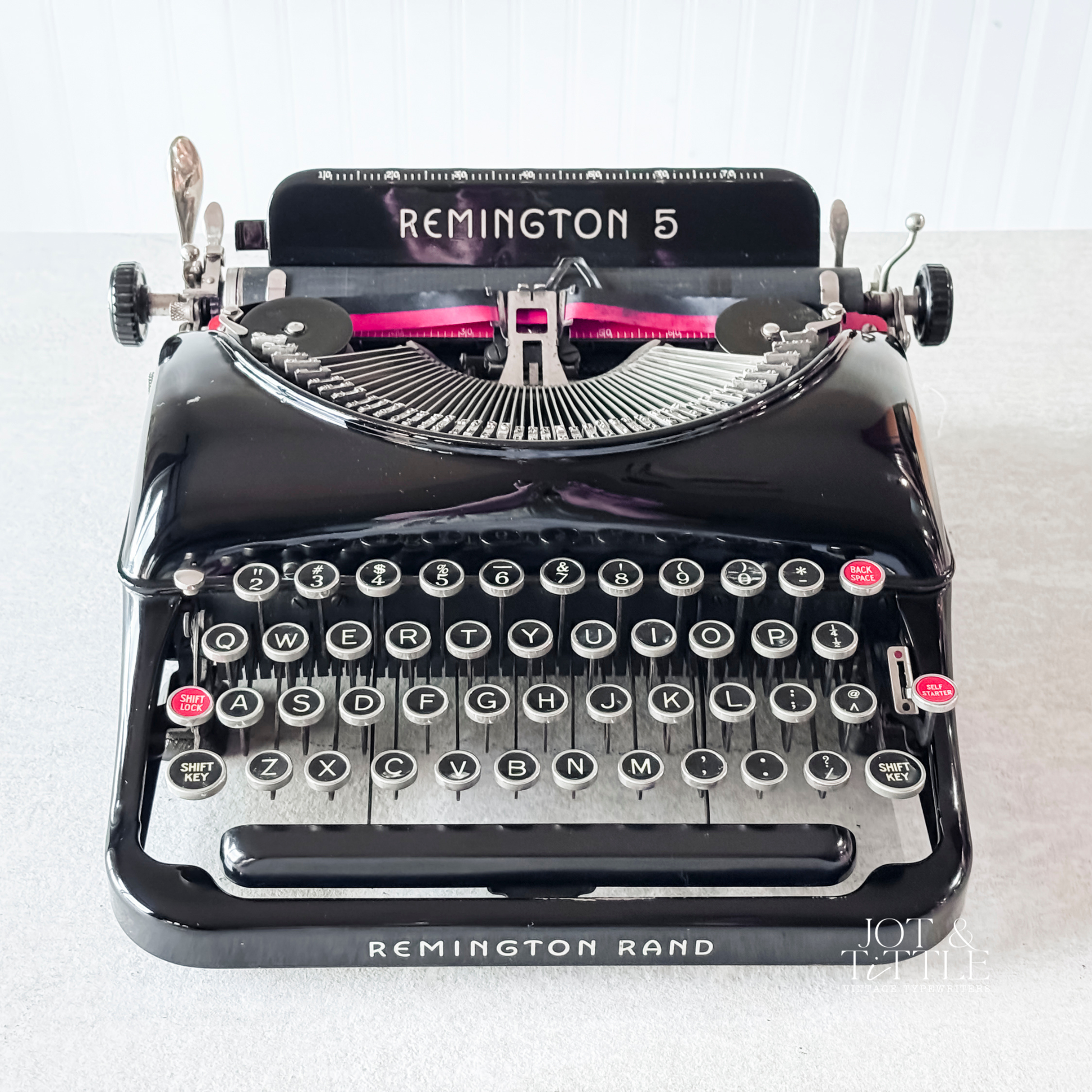 The smooth and streamlined shape of the Model 5, with its black gloss finish, gives this typewriter a moody feel of Old Hollywood, but also teases with its fun and flirty keystroke. Uses specialty spools. New feed rollers installed.