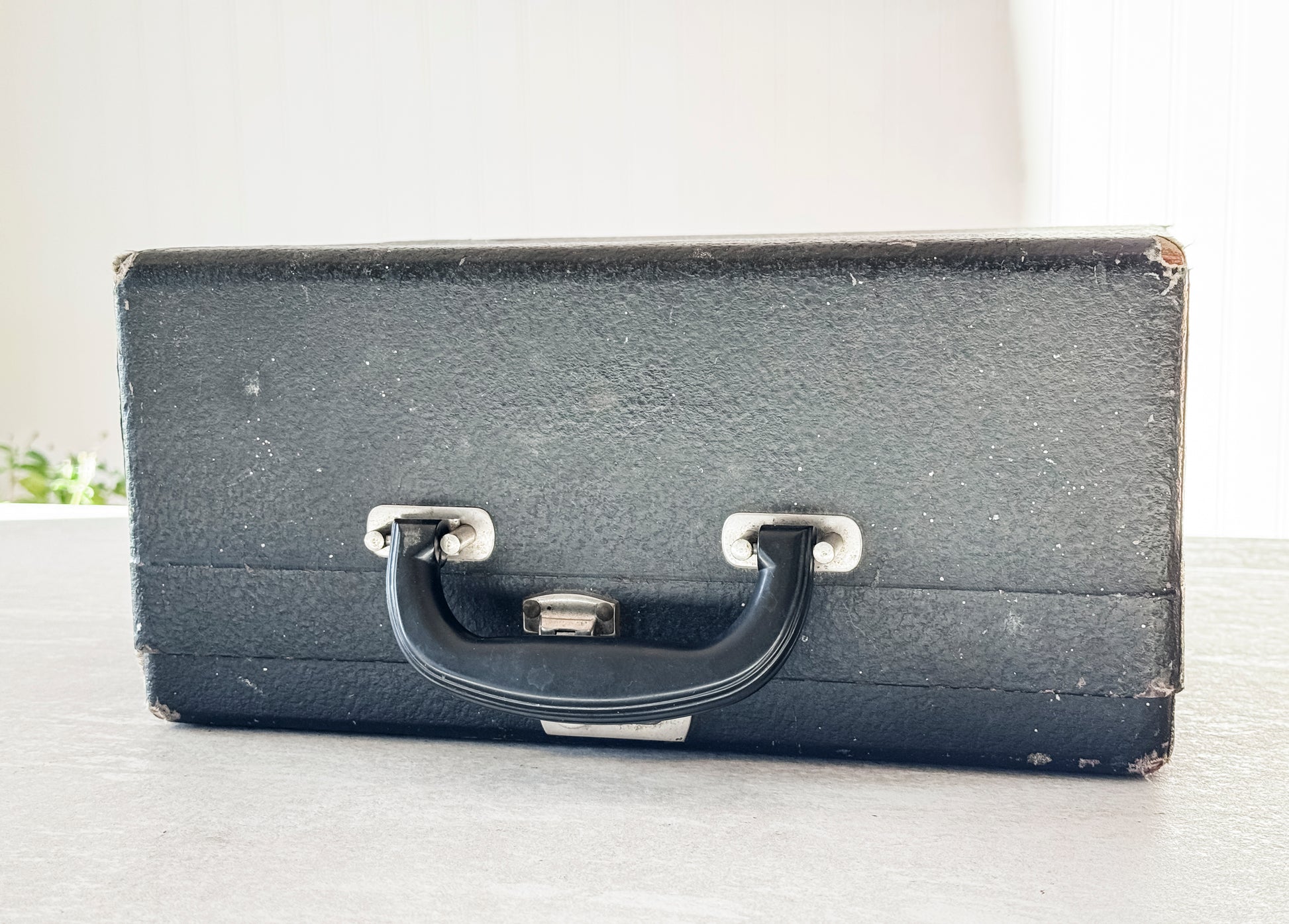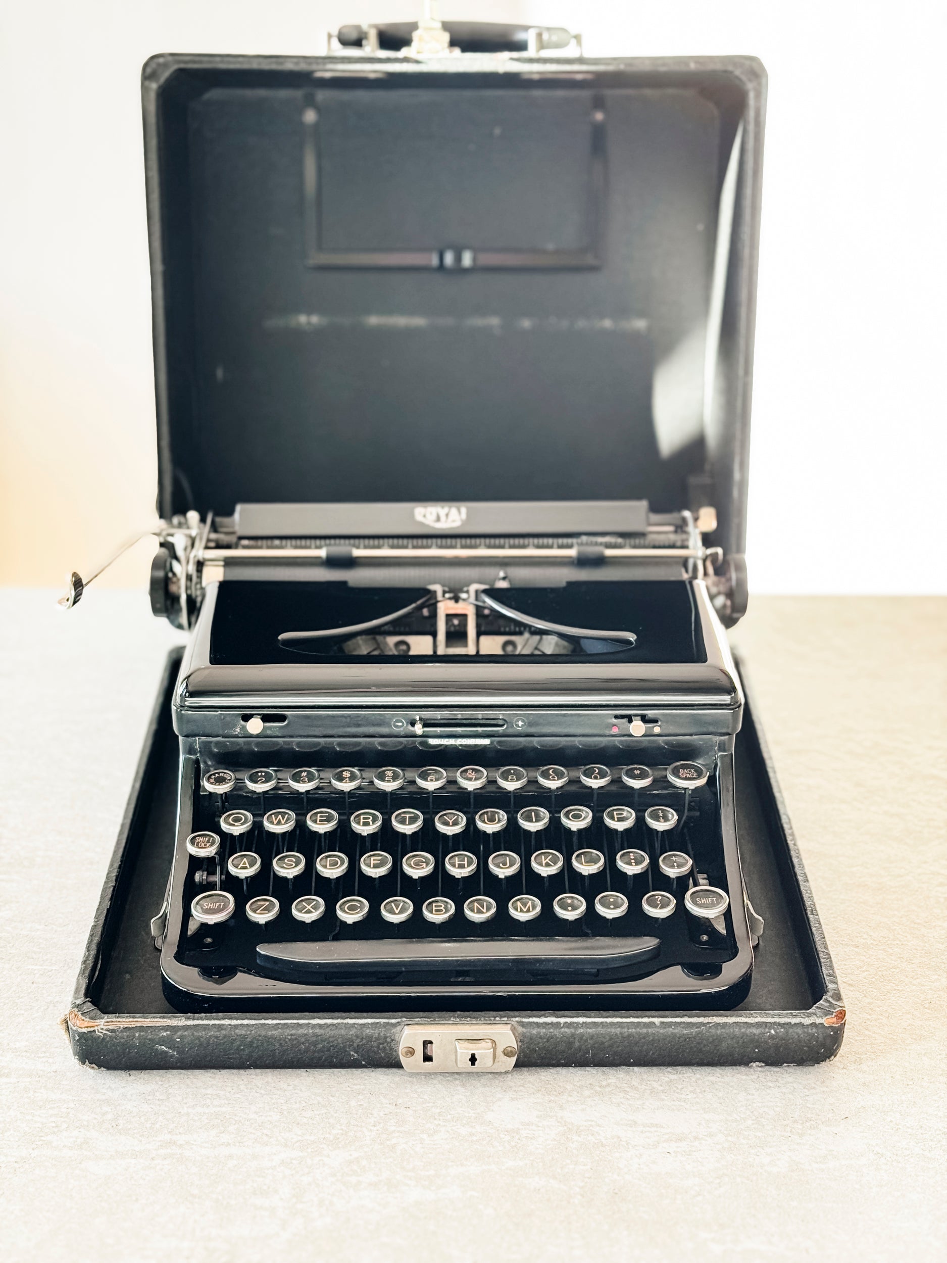 EXTERIOR + CASE: A solid case in good condition. There is some wear and tear on the exterior of the case, but it remains sturdy. The exterior of the typewriter is in excellent condition as well; only a small chip on the top left side of the cover.