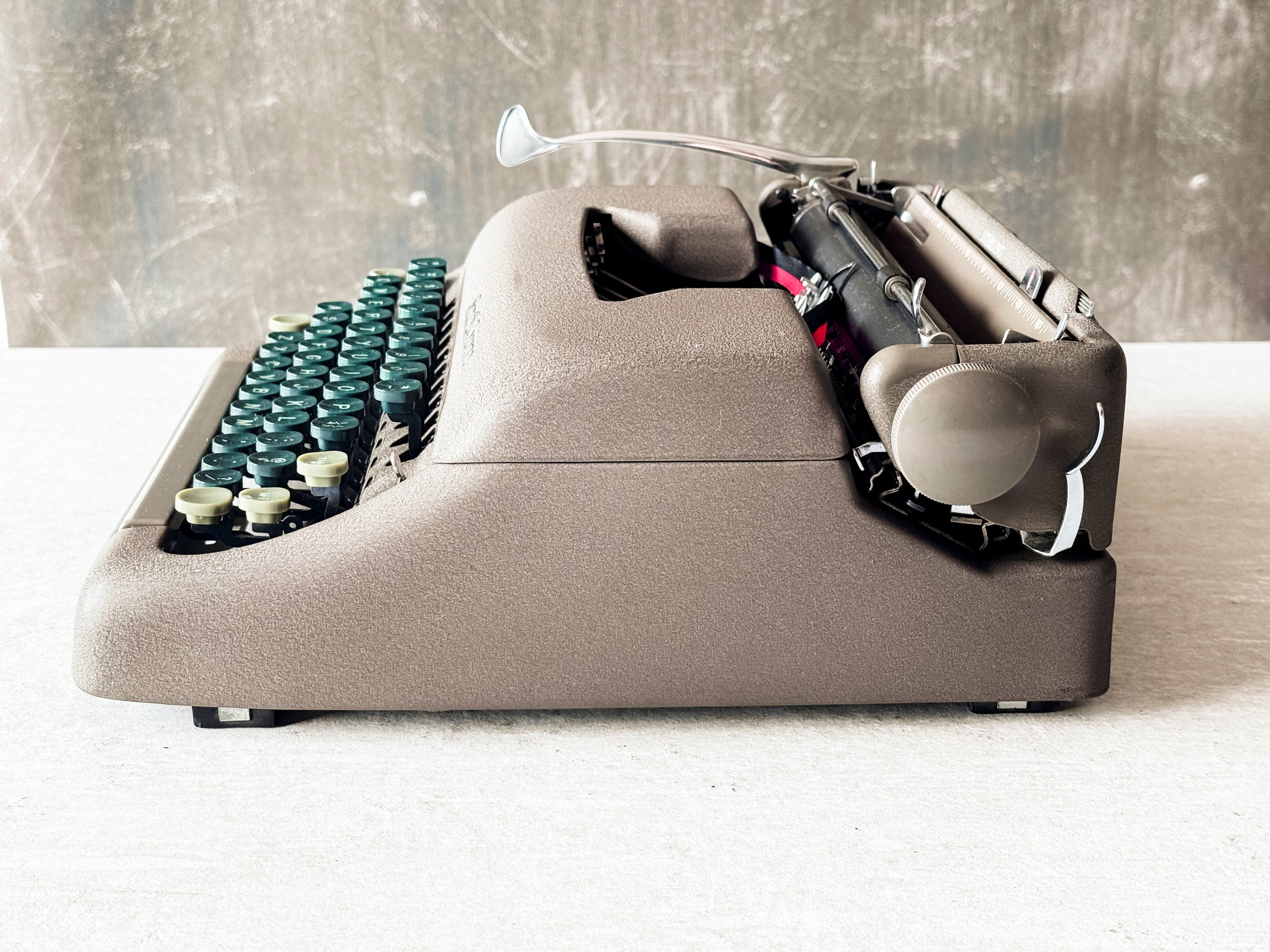 EXTERIOR & CASE: Comes with the original hard-sided black case, in good condition. The matte finish of the typewriter is beautiful, with dark brown and dark green keys and toffee-colored accent keys. Quite handsome. There is a slight smudge on the top, but it is only noticeable in certain light angles.