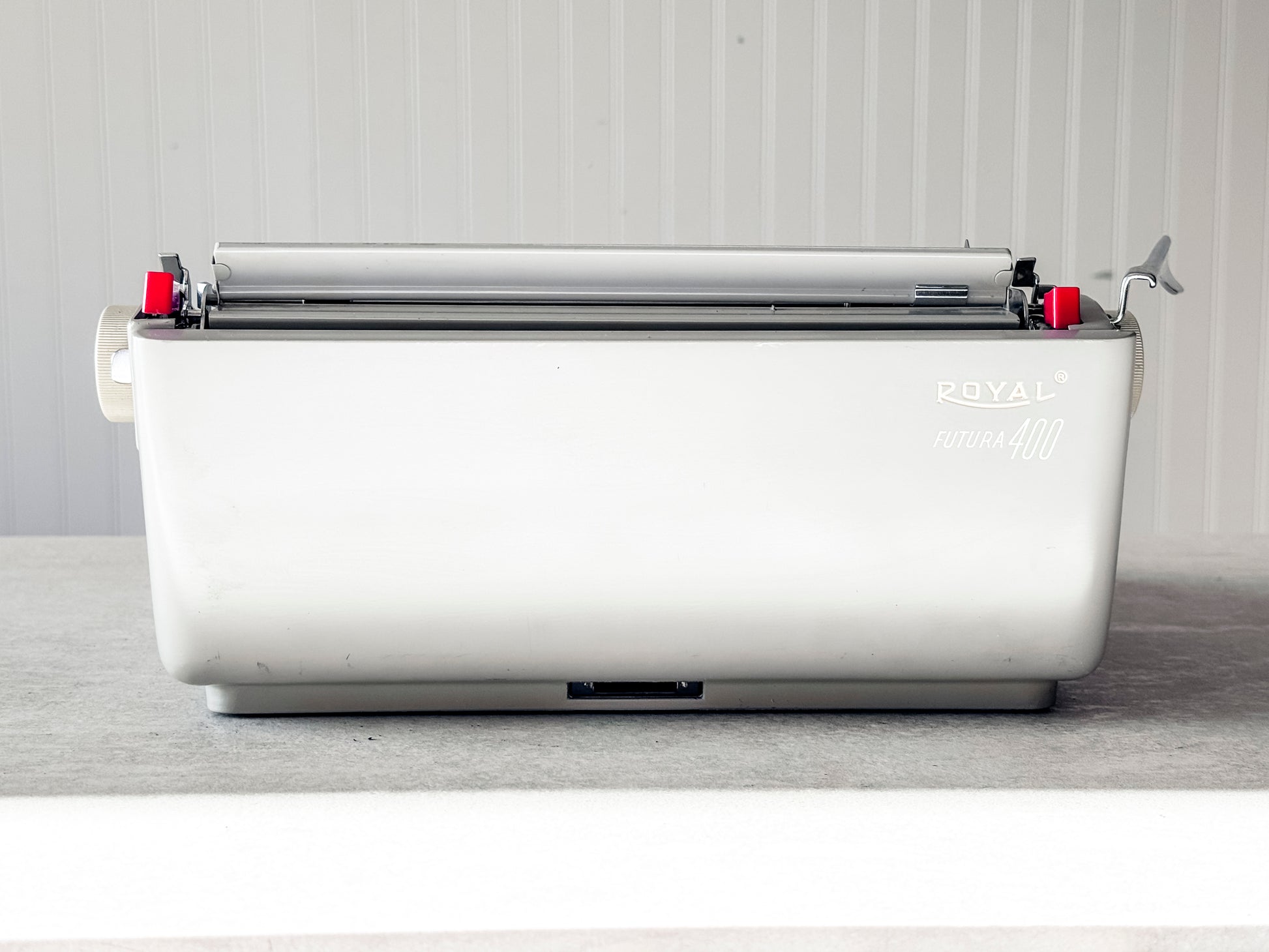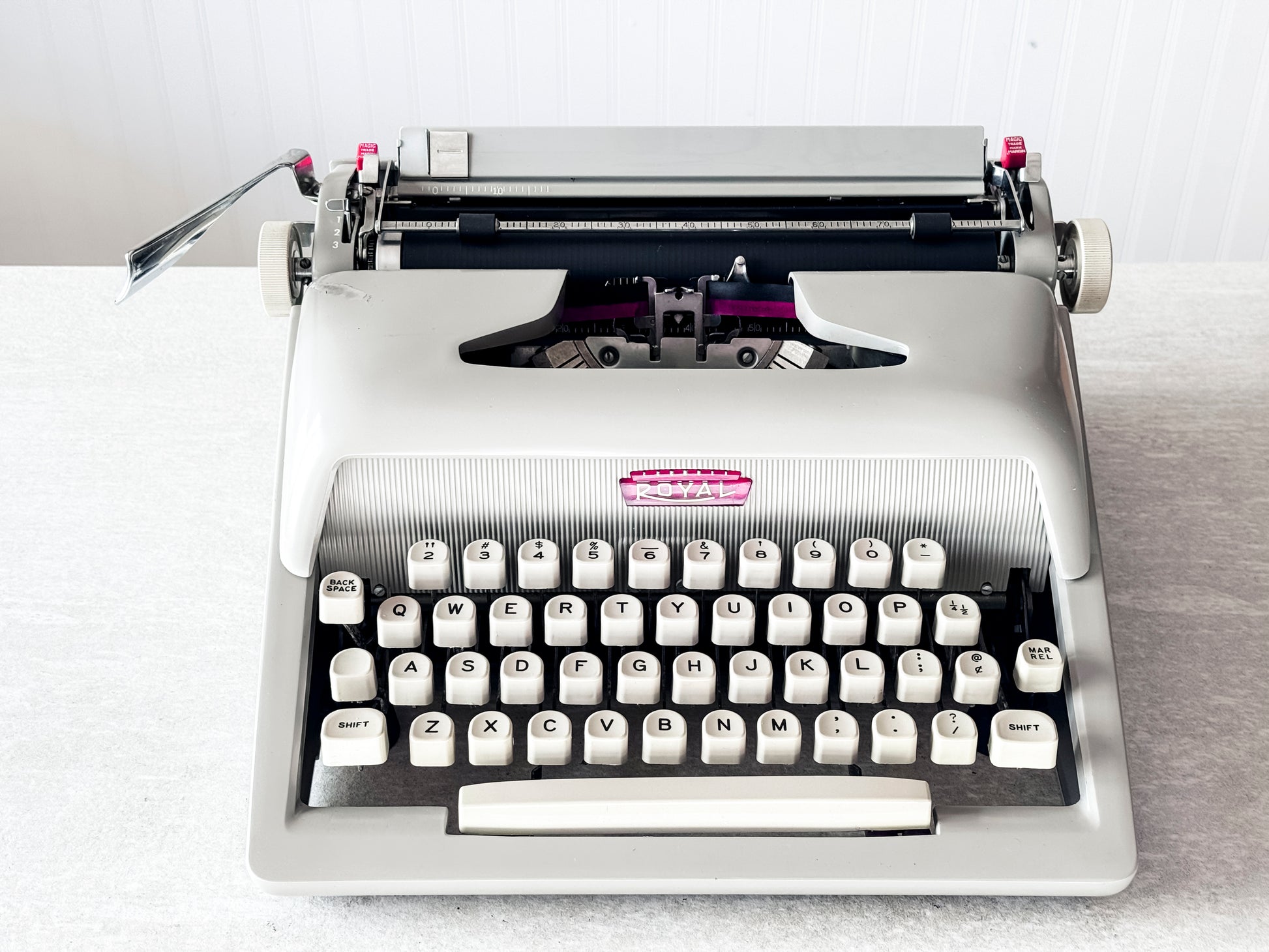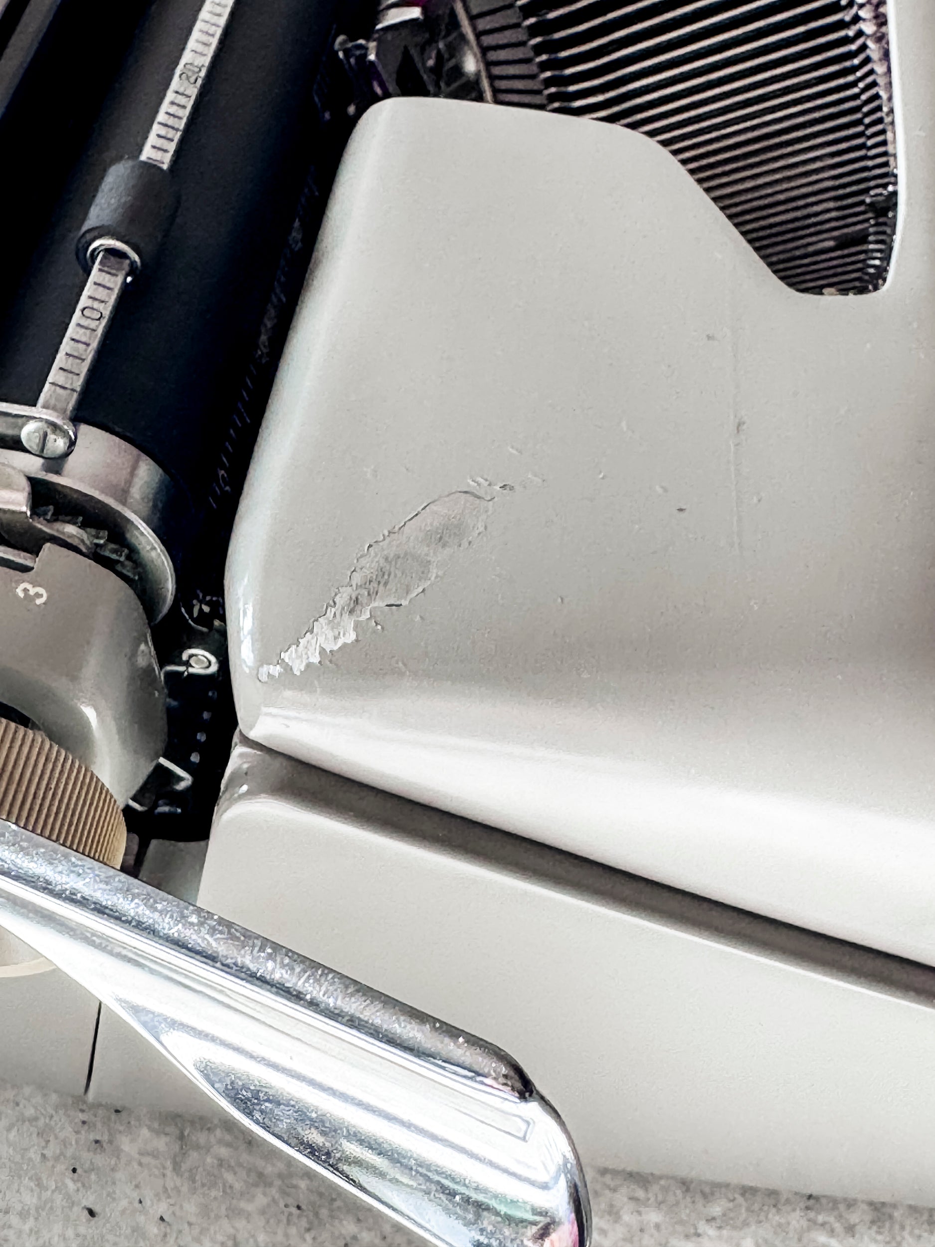 EXTERIOR + CASE: The original case is in excellent condition. The exterior of this Royal is a clean and simple Dove Gray. There is a significant scratch on the top of the cover. The rest of the exterior looks very good.