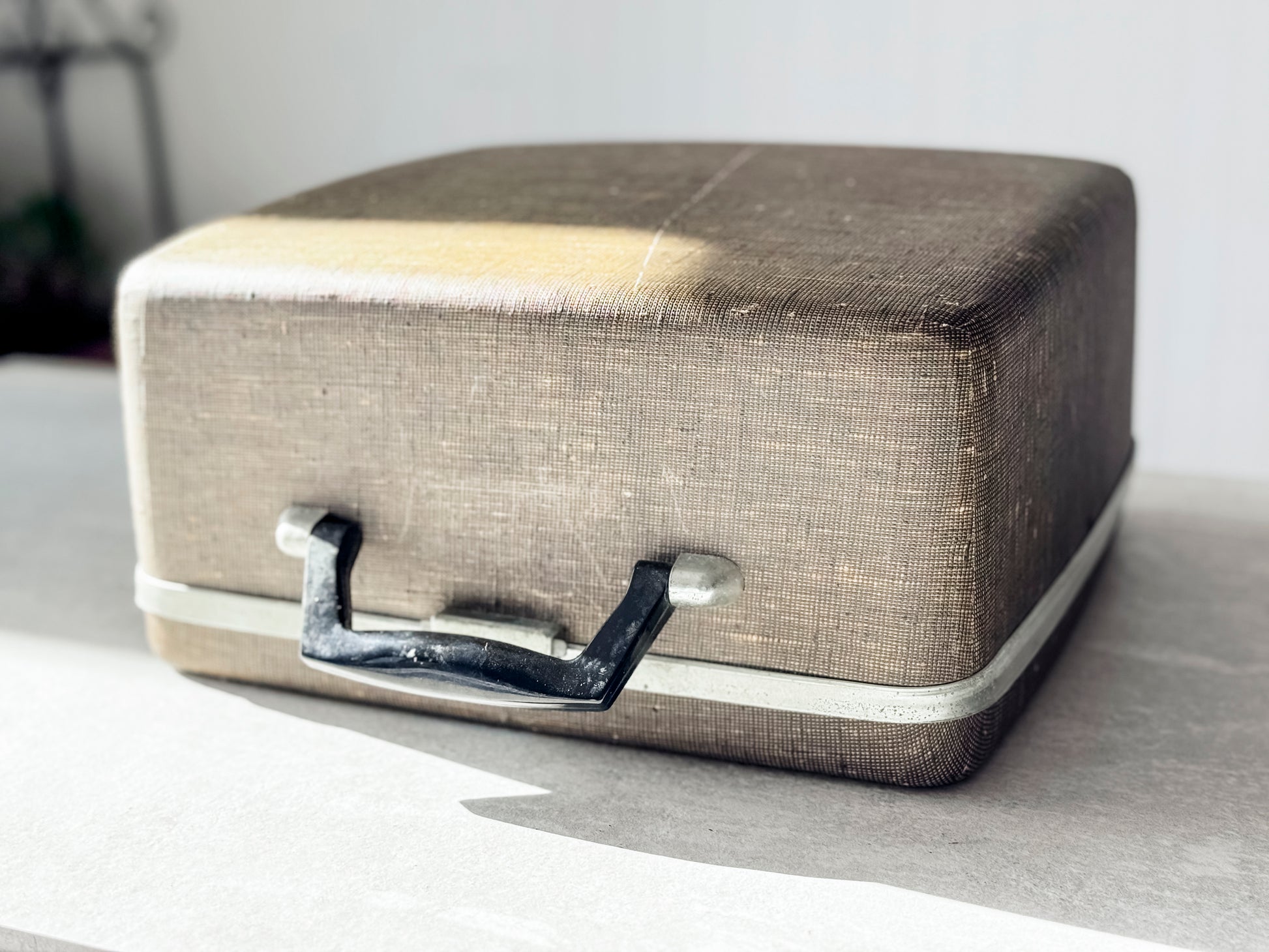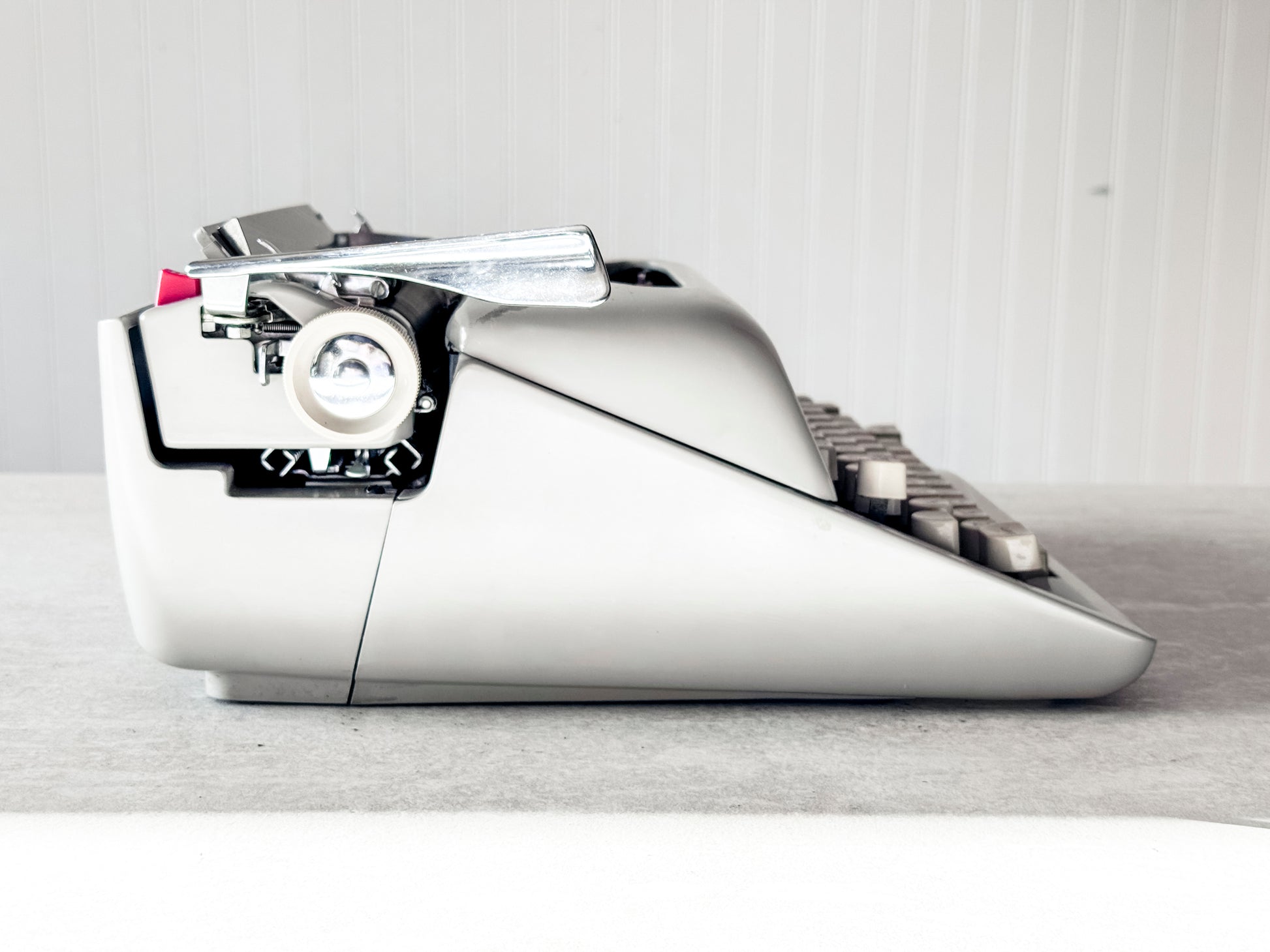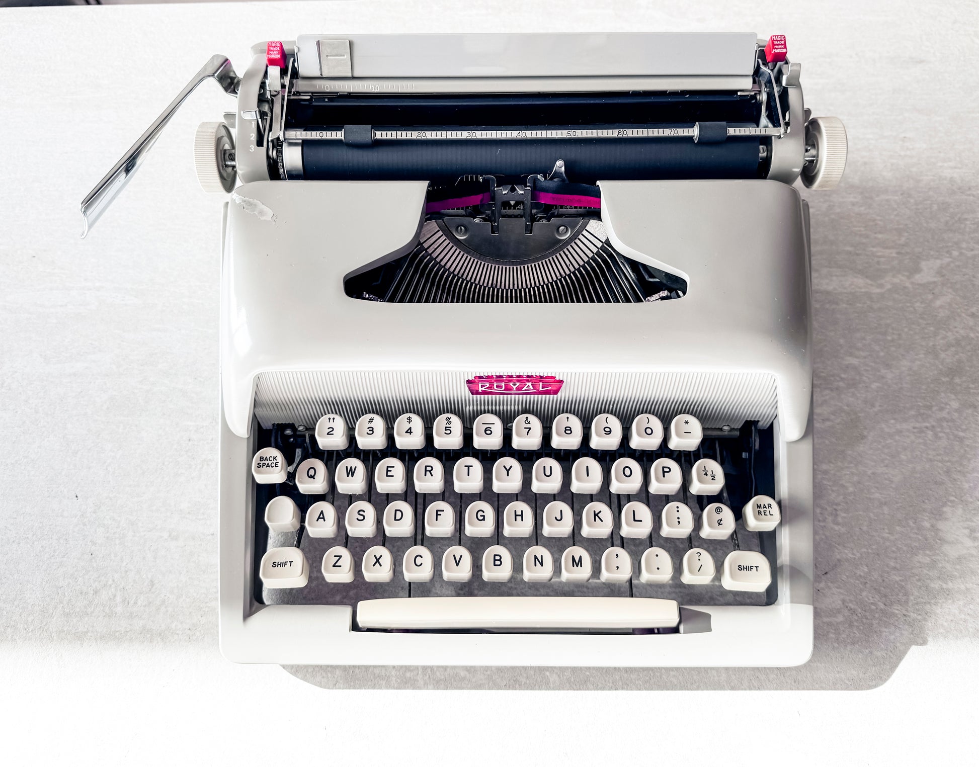EXTERIOR + CASE: The original case is in excellent condition. The exterior of this Royal is a clean and simple Dove Gray. There is a significant scratch on the top of the cover. The rest of the exterior looks very good.